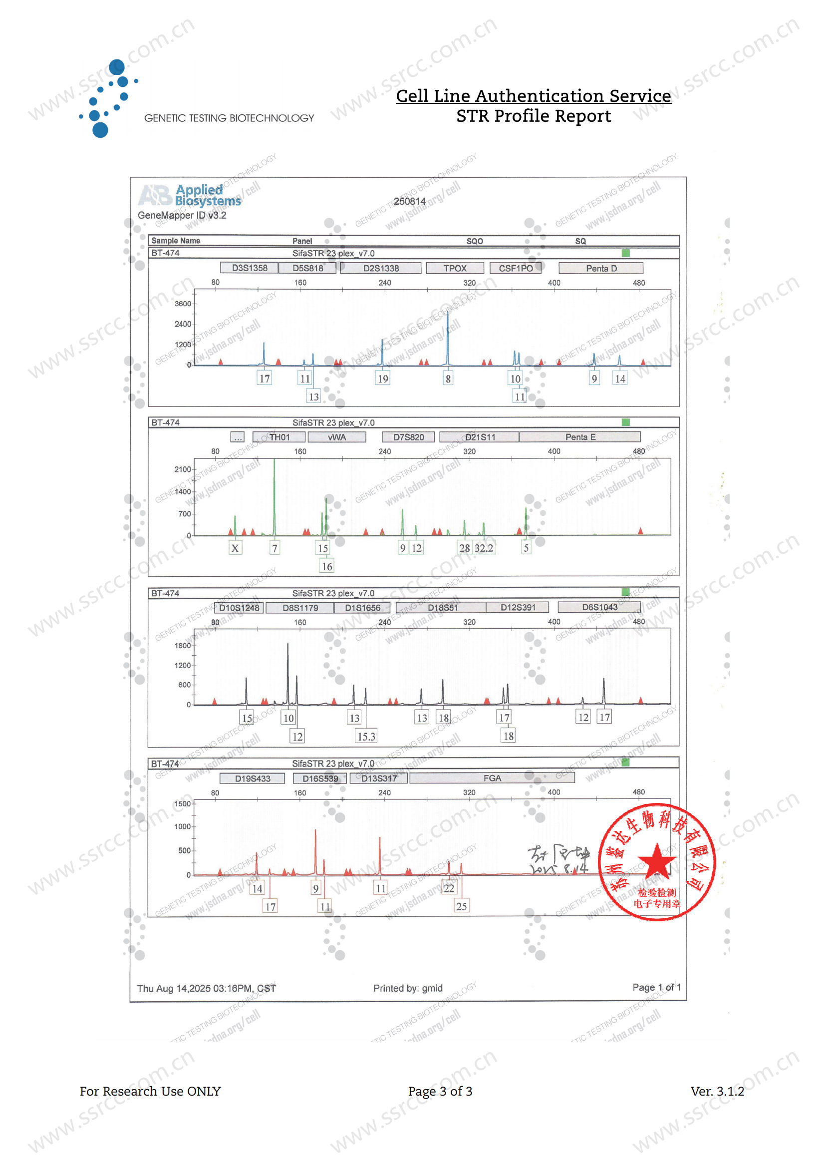 Amelogenin :X ;CSF1PO :10 ,11 ;D13S317 :11 ;D16S539 :9 ,11 ;D18S51 :13 , 18 ;D19S433 :14 ,17 ;D21S11 :28 ,32.2 ;D2S1338 :19 ;D3S1358 :17 ;D5S818 :11 ,13 ;D7S820 :9 ,12 ;D8S1179 :10 ,12 ;FGA :22 ,25 ;TH01 :7 ;TPOX :8 ; vWA :15 ,1 |