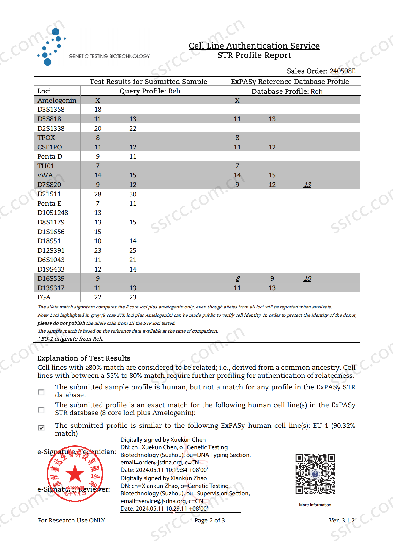 D5S818: 11, 13 D13S317: 11, 13 D7S820: 9, 12 D16S539: 9 vWA: 14, 15 THO1: 7 TPOX: 8 CSF1PO: 10, 11, 12Amelogenin: X |