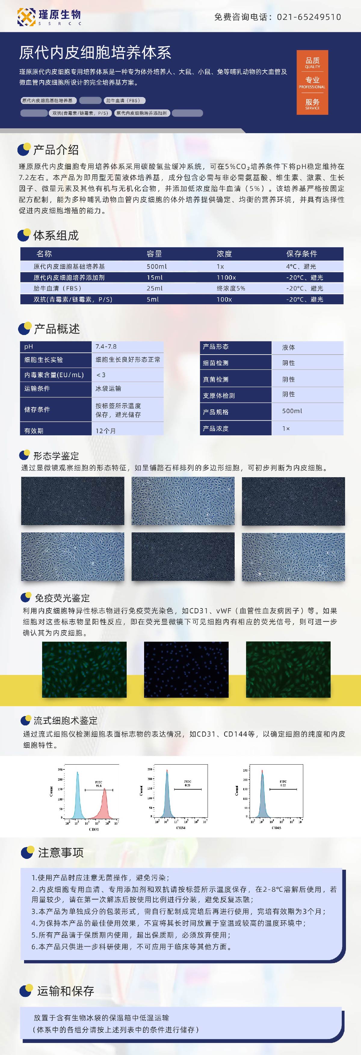 产品简介:内皮细胞培养基是专门为正常人类微血管内皮细胞体外培养设计的最适于其生长的完全培养基。是经灭菌的液体培养基,包含必需和非必需氨基酸、维生素、有机和无机化合物、激素、生长因子、微量矿物质和低浓度胎牛血清(5%)。该培养基缓冲体系为重碳酸盐,在含5%CO2的细胞培养箱中平衡后pH值为7.4。该培养基的配方能够选择性的促进正常人类微血管内皮细胞体外培养中的增殖和生长,并为其达到最理想营养平衡状态。 内皮细胞培养基包含500 ml基础培养基,25mll胎牛血清(FBS, Cat. No. 0025) 、5ml 内皮细胞生长因子(ECGS, Cat. No. 1052 )、5 ml青霉素/链霉素溶液(P/S, Cat. No. 0503)
