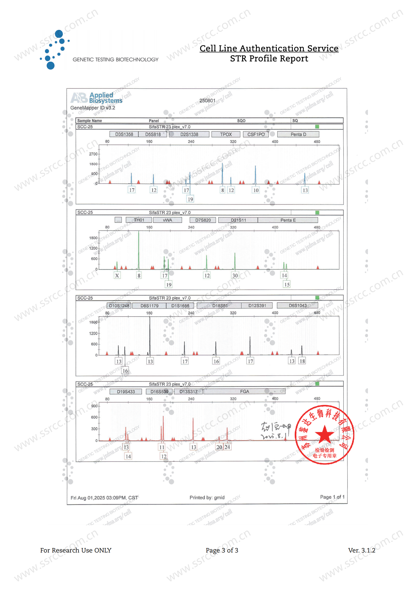 Amelogenin: X CSF1PO: 10 D13S317: 13 D16S539: 11,12 D5S818: 12 D7S820: 12 THO1: 8 TPOX: 8,12 vWA: 17,19 |