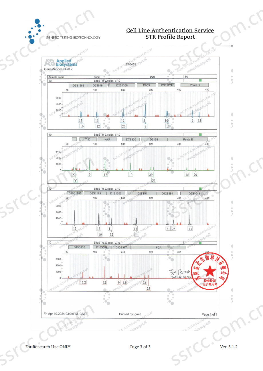 Amelogenin: X,Y;CSF1PO:10,11;D13S317:9,13;D16S539:12,13;D18S51:13,14;D19S433: 15.2;D21S11:29,31; D2S1338: 19, 20; D3S1358:15,16;D5S818:11,12;D7S820:10; D8S1179:15,16;FGA:22,25;TH01:9;TPOX:8,9;vWA:17; |