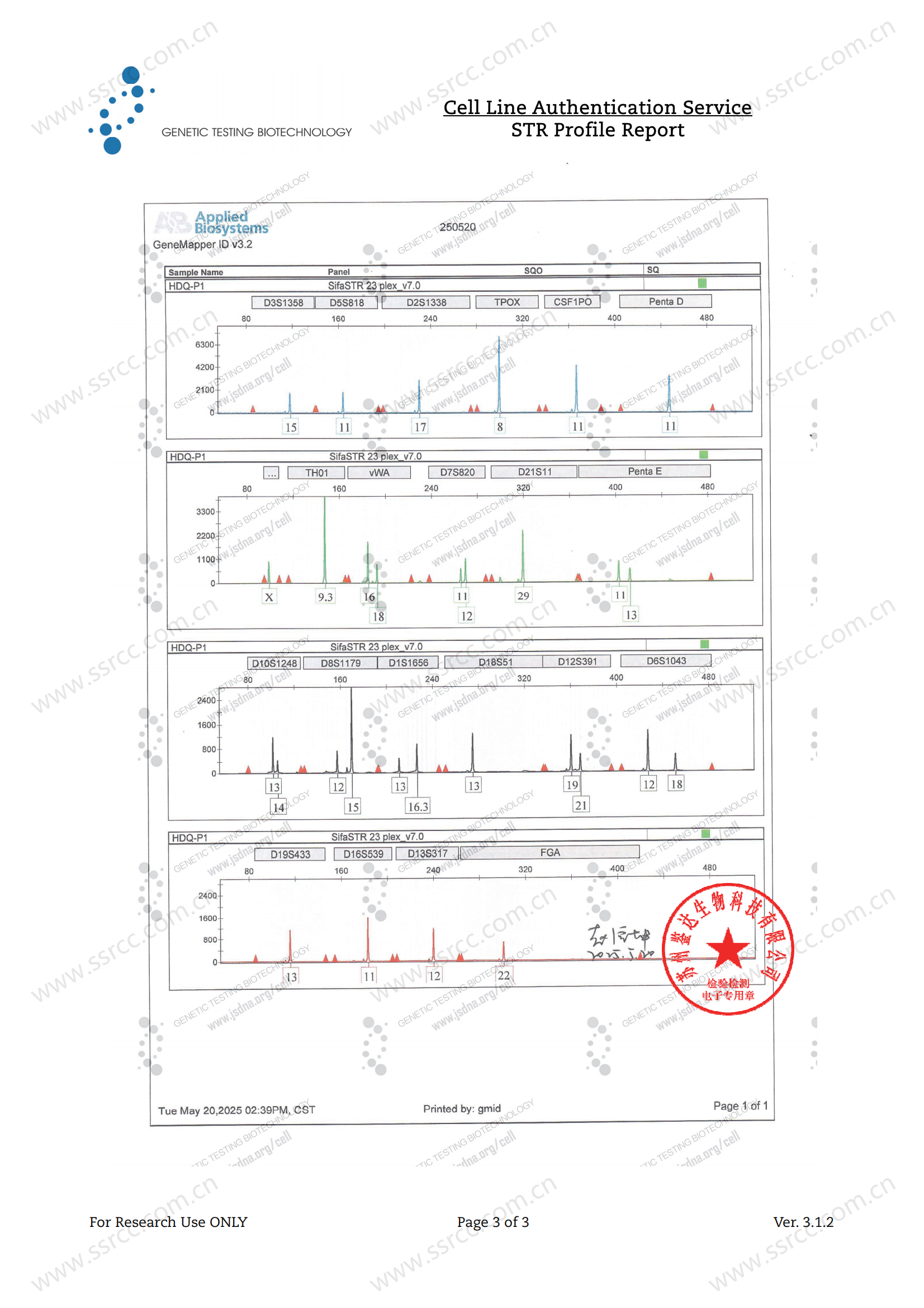 Amelogenin X CSF1PO 11 D2S1338 17 D3S1358 15 D5S818 11 D7S820 11,12 D8S1179 12,15 D13S317 12 D16S539 11 D18S51 13 D19S433 13 D21S11 29 FGA 22 Penta D 11 Penta E 11,13 TH01 9.3 TPOX 8 vWA 16,18 |
