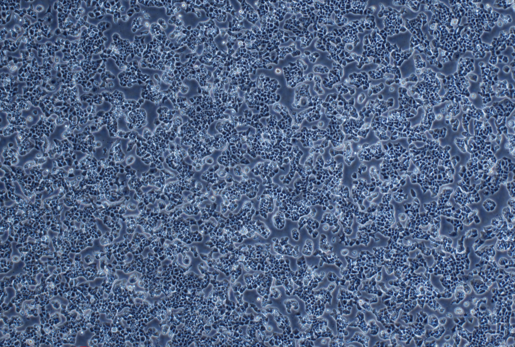 来自胸腔积液的一种广泛的鼻中隔恶性肿瘤,诊断为间变性鳞状细胞癌。几乎正常的核型,稳定的染色体数目和可能来源于恶性细胞使细胞系独特的永久人类细胞系。细胞非常小,成簇生长,融合形成厚层 |